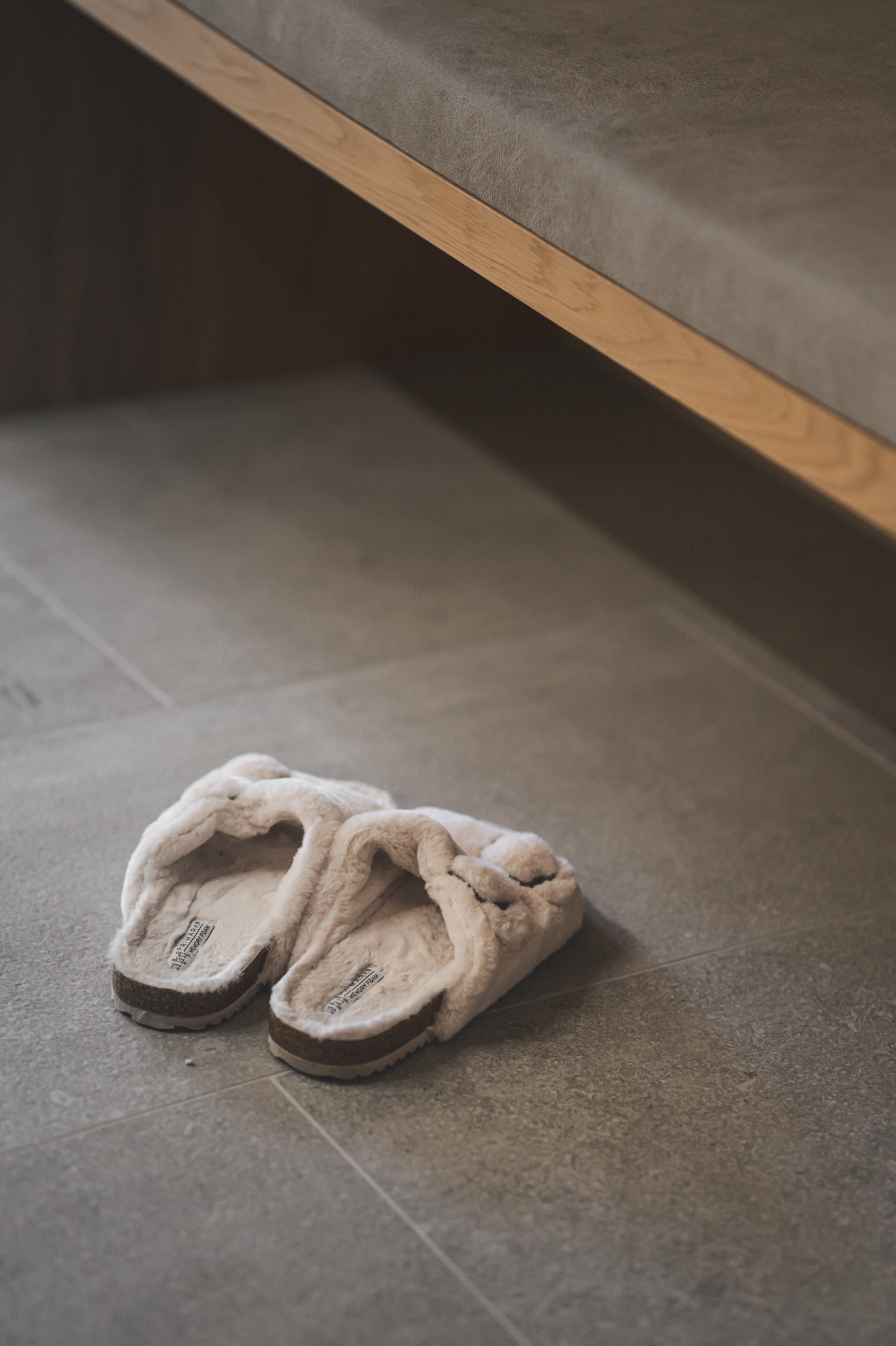 Badetasche mit Handtücher und Badeschuhe im Zimmer