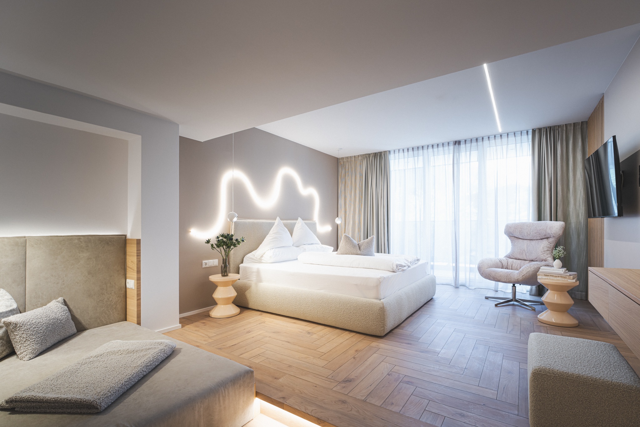 Die Kombination aus hochwertigen Textilien, Naturtönen und modernen Leuchtelementen sorgen für eine stimmungsvolle Atmosphäre in unserem Doppelzimmer Wild Style Studio.